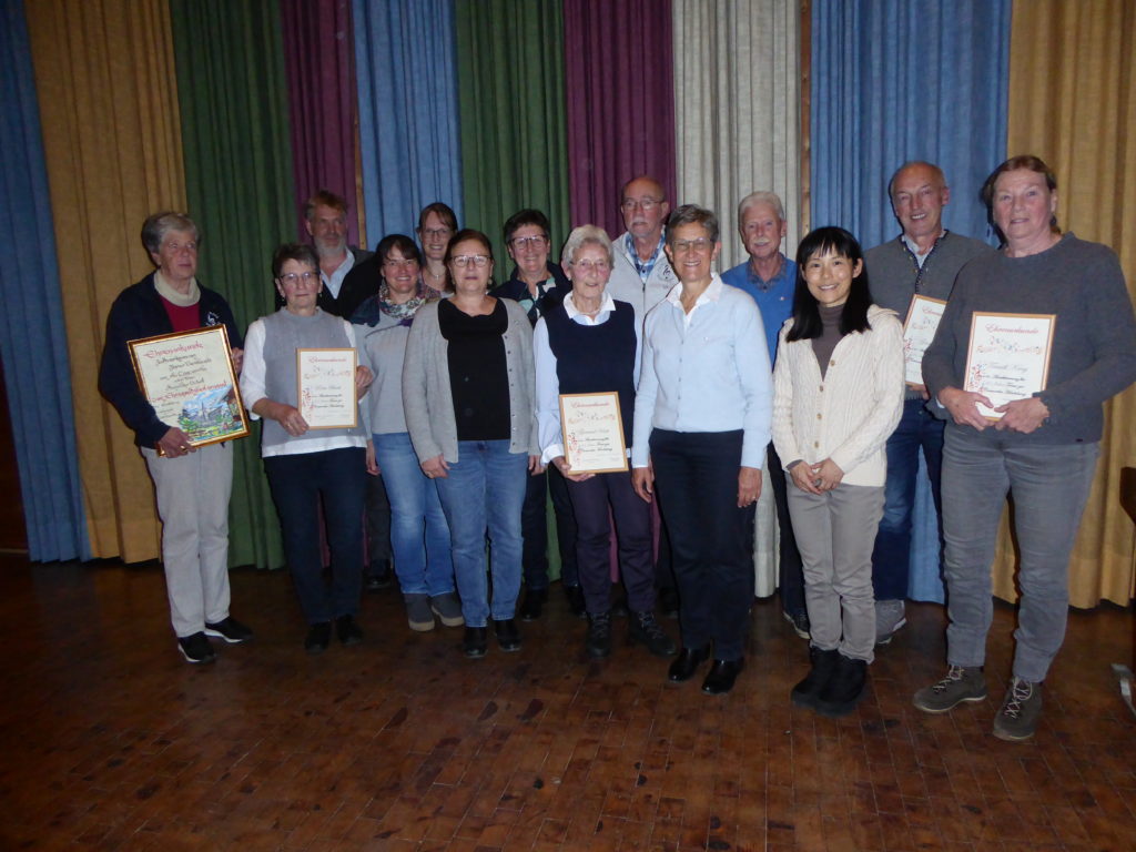 Vordere Reihe von links nach rechts: Angelika Scholl (40 Jahre Mitglied), Rita Bach (60 Jahre Mitglied), Heidi Karg (Beisitzerin Chor), Vera Waibel (2. Vorsitzende), Gertrud Ueth (25 Jahre Mitglied), Renate Kremsreiter (1. Vorsitzende), Motoko Matsuno (Chorleiterin), Traudl Karg (Beisitzerin Orchester, 60 Jahre Mitglied)
